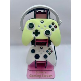 Laser cut, wooden handmade gaming station that holds 2 consoles and headphonesIf the colour you want isn’t listed, then please pop me a message.All my wooden items are cut and hand painted by myself, so please allow 2-3 days for your order to be completed.Colours AvailableBlackWhiteRedBlueGreenPinkPurple..